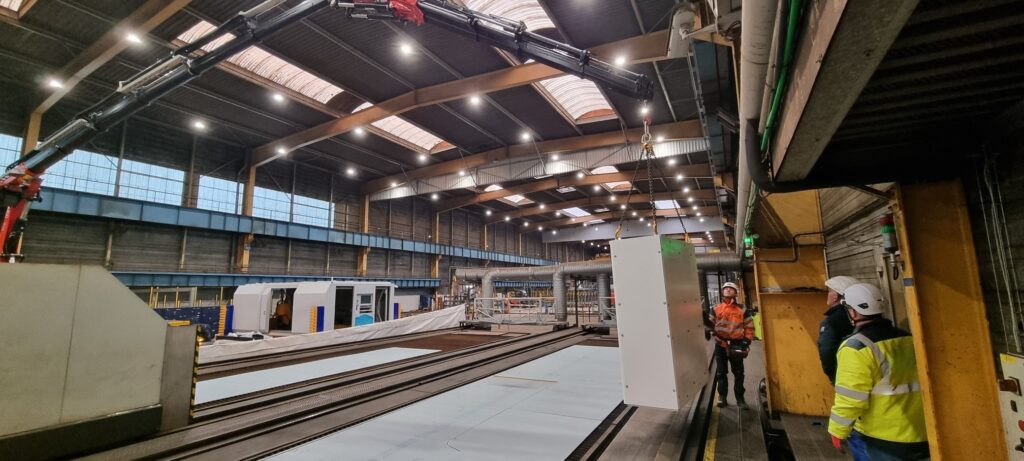 Une opération technique d’envergure, puisque l’équipement a dû être gruté à plus de 20 mètres, pour traverser l’installation des machines actuelles, dans un environnement industriel contraint.
